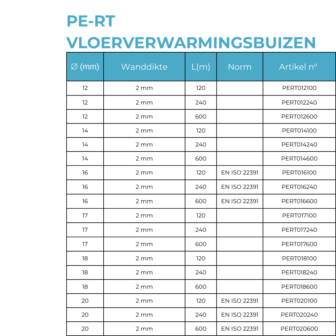 - Materiaal: PE-RT (Polyethyleen met verhoogde temperatuurweerstand)