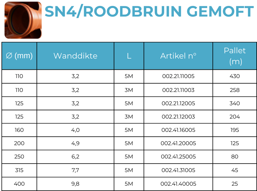 De buizen zijn verkrijgbaar in gemofte uitvoering volgens de norm EN 681-1 of EN 681-2 of met gladde uiteinden. Standaardlengtes 3- of 5 meter (afwijkende lengtes op aanvraag).